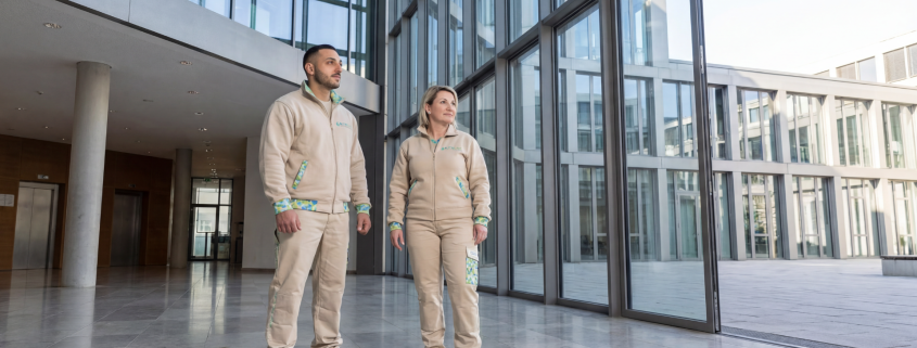Zwei BLITZBLANK-Mitarbeitende in Arbeitskleidung in einem modernen Glas-Atrium. Tagreinigung sorgt für direkte Abstimmung und schnelle Lösungen.